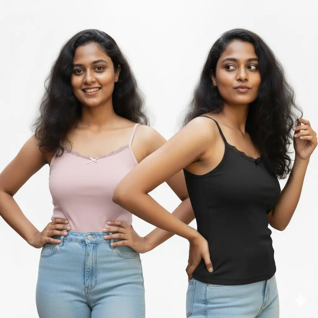Double the style, double the comfort 💕 Get the best of both worlds with our Combo Black & Pink Lace Trim Cami Top with Pad. Perfect for everyday wear, lounging, or layering – this set brings you both elegance and functionality in one pack.